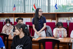 (Sinh viên tích cực trao đổi các thông tin về cách phát triển trung tâm tiếng Anh và nhận phần quà từ diễn giả)